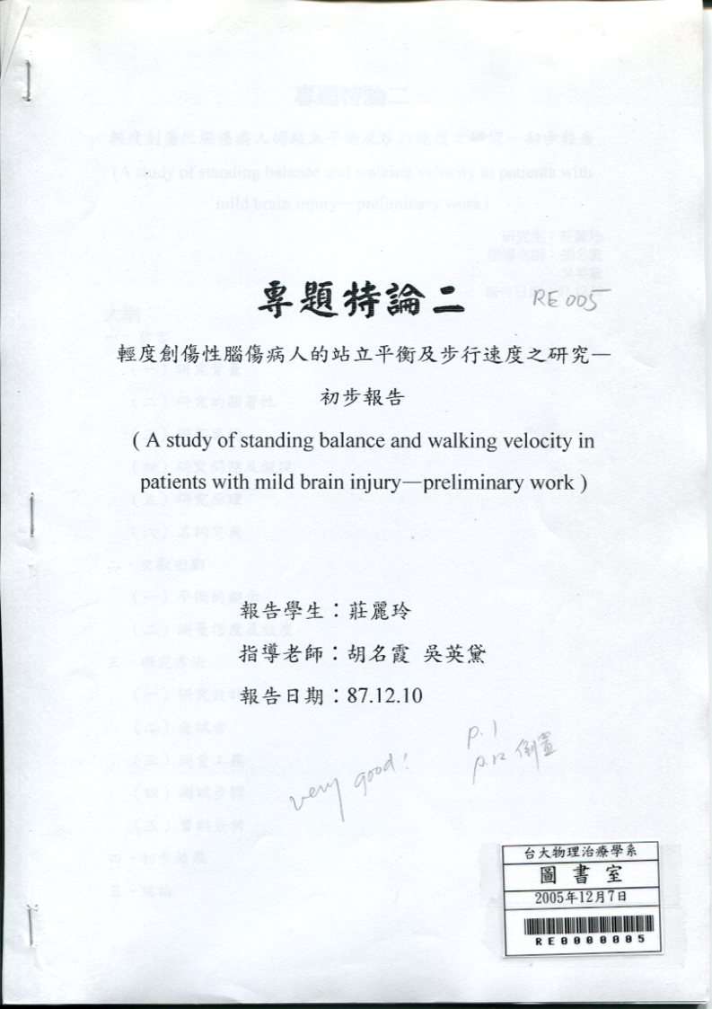 輕度創傷性腦傷病人站立平衡及步行速度之研究-初步報告